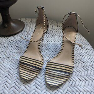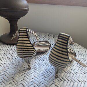 Coach stripe kitten heel sandal in leather but with a kind of reptile feel. Slight discoloration on strap. 2in heel.