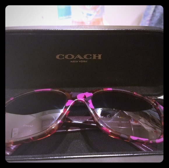 NWOT coach sunglasses. The color is purple confetti, bought them but changed my mind, you can put your prescription in them if you want. Lenses are a gradient grey that fades into a purple. Comes with the case. Open to offers.