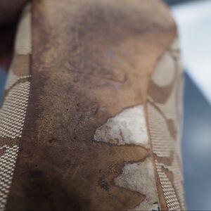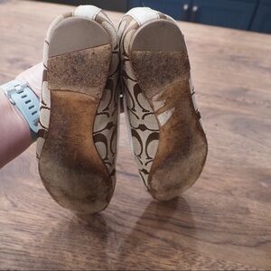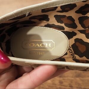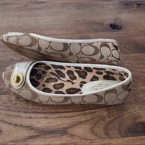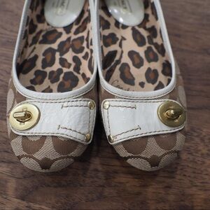 Coach Size 7 Laren ballet flats Tan jacquard signature logo with white leather trim Turnlock hardware at toe Leather outsole Rounded toe Leopard print fabric interior lining Some wear on heels and dirt on white leather GUC