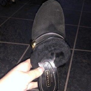 This is a pair of Coach size 9.5 black suede Ivanka clogs with black fur along top of clog by your foot. Wood heal. Gold studs along bottom and one on top by 2 leather bands that go across. There are chips and cracks, and the right clog needs some TLC along with portions of the left as well. Glue and black paint would help! But the suede, fur trim, and gold studs are in great condition.