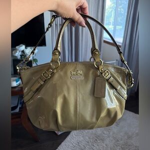 Elegant Coach satchel in shiny tan color . Features dual handles and signature logo.