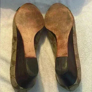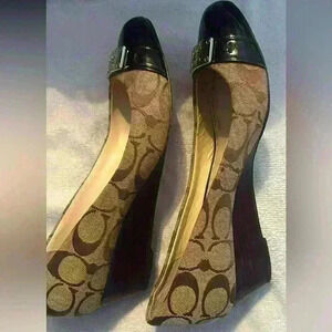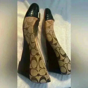 Coach tan and brown logo black patent round toe cap wooden wedge heeled size 8.5