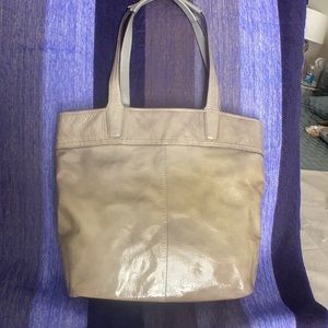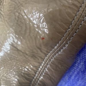 Soft patent leather with a perforated design on the front, light weight, large, roomy tote bag. 2 pockets inside, one for iPhone and a roomy zipper pocket. This bag was not used and it is in excellent condition except tiny red hardly noticeable spot on the side (see the picture) Priced accordingly. The last picture shows the true color. Straps have 9" drop.