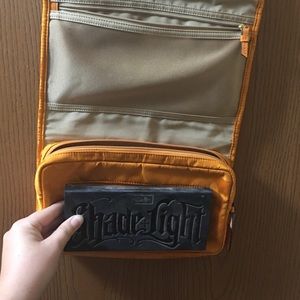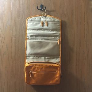 Coach travel/ make up bag. Rolls in thirds. Has magnetic closer, color is orange. Holds a lot of makeup for on the go ladies. Nothing wrong with it. Found myself not using it as much as I thought.