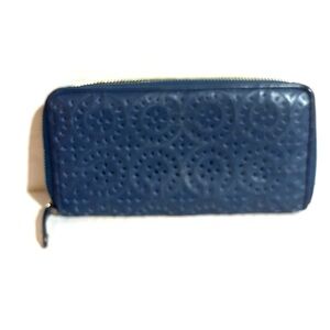 Coach vintage Stylish blue wallet with embossed design. Features a secure zip closure. 6 cash slots 12 cards slots minor stains zipper pull tab have some tear hight 4” wide 7.25” The dimensions are based on approximately measurements before placing an order please check take a moment to view all photos using feature for a closer look