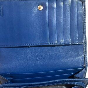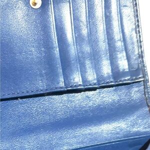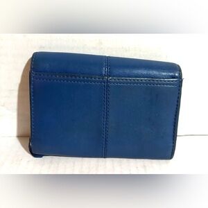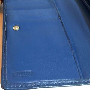 Elegant and stylish, this Coach wallet in blue is perfect for any occasion. Crafted with quality materials, it offers both functionality and fashion 6 compartment 5 pockets at interior wall 1 cash slot open pocket at back logo at front exterior have some stains hight 4” wide 5.5” depth 1”The dimensions are based on approximately measurements before placing an order please check take a moment to view all photos using feature for a closer look