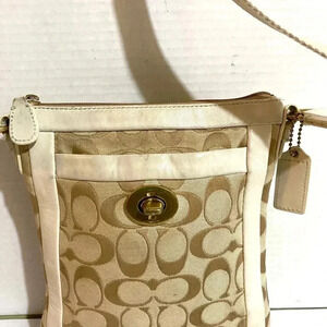 Coach CC signature print crossbody handbag with leather trim with nylon strap with gold tone hardware main compartment fabric lining open with a front lining & exterior have some stains hangtag at side hight 8” width 7” depth.05” shoulder drop 22” adjustable The dimensions are based on approximately measurements before placing an order please check take a moment to view all photos using feature for a closer look