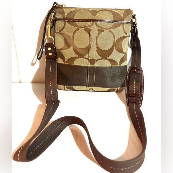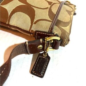 Coach vintage CC signature print canvas crossbody handbag main compartment fabric lining hangtag at side open pocket at both front and back leather trim minor stains hight 8.5” wide 8” strap drop 22” adjustable The dimensions are based on approximately measurements before placing an order please check take a moment to view all photos using feature for a closer look
