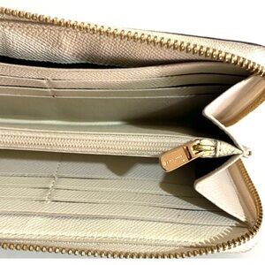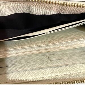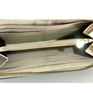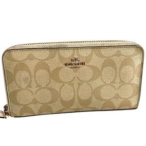 Coach vintage CC signature print canvas wallet with leather trim with main compartment 4 cards slots 12 cards slots open pocket at center logo at front hight 4” wide 7.25” depth 1” some discoloration The dimensions are based on approximately measurements before placing an order please check take a moment to view all photos using feature for a closer look