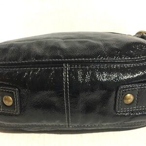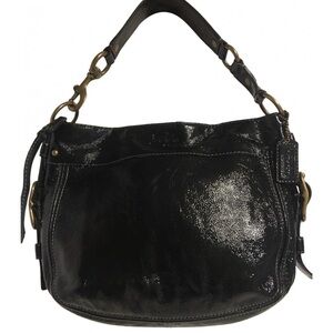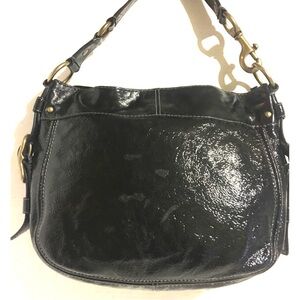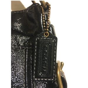 Coach vintage black patent leather hobo handbag with gold tone hardware main compartment 3 pockets at interior wall 1 zip closure logo at front fabric lining hangtag at side exterior lining have some stains marks hight 10” wide 12” depth 3” strap drop 3”The dimensions are based on approximately measurements before placing an order please check take a moment to view all photos using feature for a closer look