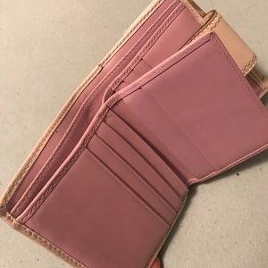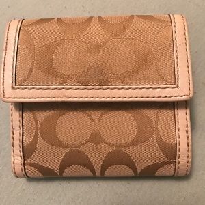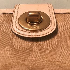 Coach wallet; tan and cream with lavender colored leather inside. Small but plenty of storage space; 4.50” x 3.75” when closed.