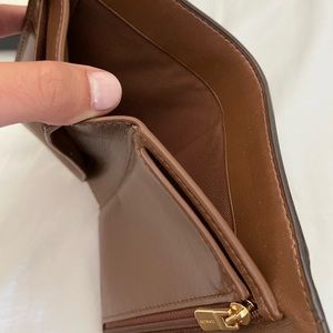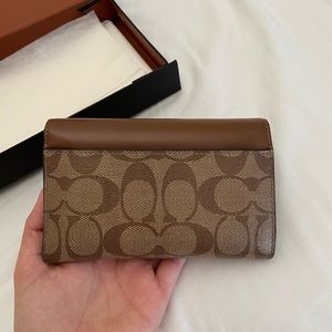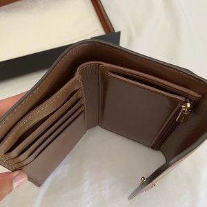 Small, beautiful brown-themed coach wallet. A classic and will not go out of style.