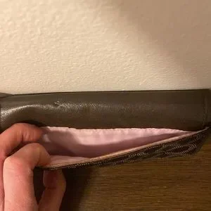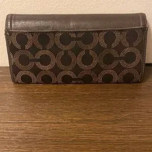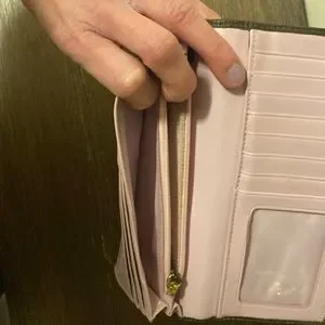 13 credit car slots plus one clear ID slot. Four large slots. Zippered coin enclosure. Large slot on back of wallet. Used condition.