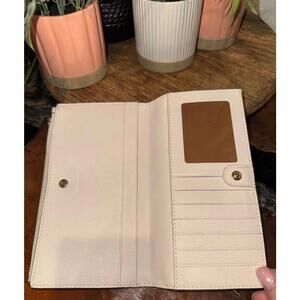 White coach Wallet. Used a few times. Only notice what looks like some pink on outside. Prob would come out with bleach. Didn’t want to try though.