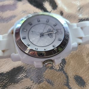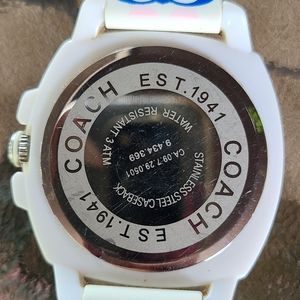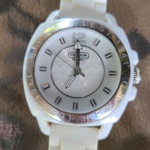 Coach watch with white rubber band. Needs battery and to be cleaned.