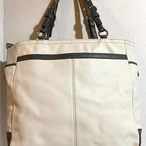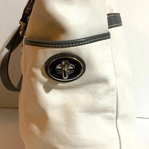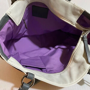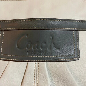Coach white/ gray leather satchel handbag with silver tone hardware main compartment 3 pockets at interior wall 1 zip closure fabric lining logo & hangtag at front open pocket at back & front pocket at both side exterior have minor marks hight 12” width 12” depth 5” strap drop 10” The dimensions are based on approximately measurements before placing an order please check take a moment to view all photos using feature for a closer look