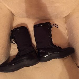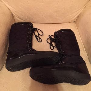 Black Coach lined winter boots with rubber outsole. Small scuff mark on left boot heel.
