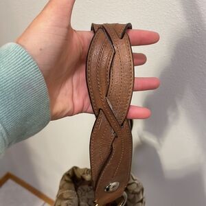 Coach woman’s canvas and brown leather twisted strap. There are some chocolate stains i believe on the front of the purse, see pictures for details.