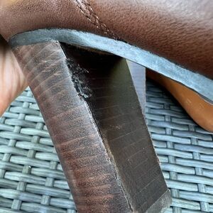 Coach women’s Tavi Brown leather round toe chunky heel ankle boots booties. Gorgeous Cognac brown color. Chunky 4 inch heel. Round toe. Gold medal coach logo detail on sides. Interior gold metal side zippers. Minor signs of where. Right boot has moderate wear to front of heel ( underside). It is not super noticeable when wearing. See last two pictures. Women’s size 9.5.