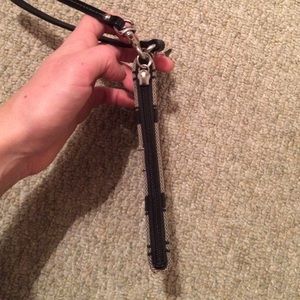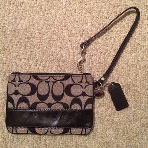 Coach wristlet grey and black with leather stripe. Never used. Perfect condition. No signs of wear. Dimensions 4" x 6". Matches with pretty much anything!