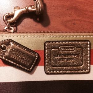 Coach wristlet with horizontal stripes. In good condition, measures 4 x 6 inches.