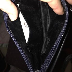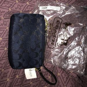 REASONABLE OFFERS WELCOMED!! BNWOT navy blue coach wristlet. Perfect for a night out on the town or just everyday use! The front has a little pocket as well with the little turn lock. Used one time. Excellent condition! Smoke and pet free!
