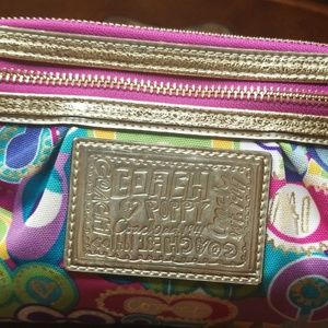 Multi color coach wristlet, like new in good condition, two zipper compartments that's good for keys, cell phone and other small items. Pink interior.