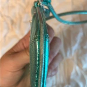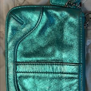 Green metallic coach wristlet. Signs of ware around corners. See pictures