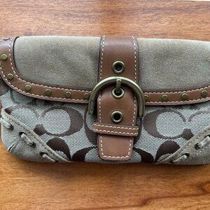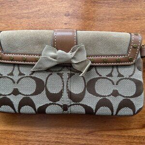 Coach wristlet in tan/brown - NWOT. Light tan suede with darker tan leather trim and buckle and gold tone studs. Tan fabric interior. Tan canvas with the Coach "C," with a tan fabric bow on the back. Tan leather wrist strap is removable.