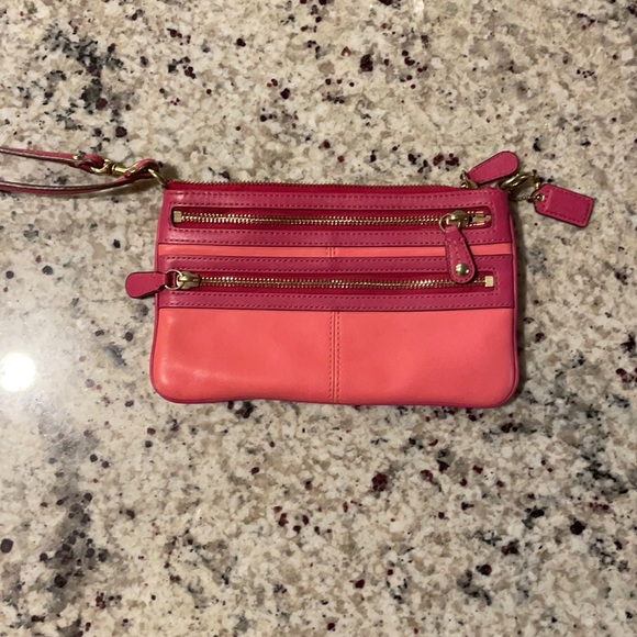 Super cute Coach Wristlet. Pink with magenta trim. 1 large zippered compartment and two smaller zippered compartments. Measures 7.5” wide and 4.75” tall. One small spot on lining. See photo. Otherwise looks new.