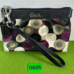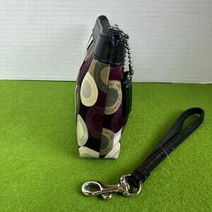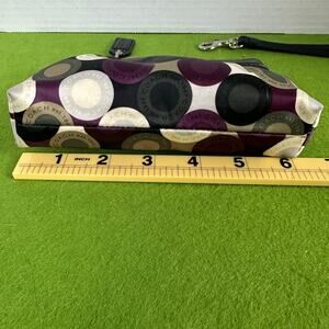 Coach wristlet with side zip, or remove the wristband and use as a change purse / wallet. One open pocket inside 8in purple, exterior in pretty pattern. Beautiful ! perfect . 6 long, 4" tll and about 1.5" wide at base. Perfect for the backpack carrier too ! Thank you for your consideration if this excellent condition Coach wristlet !