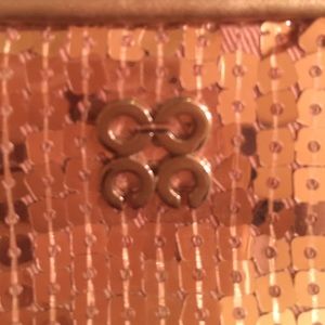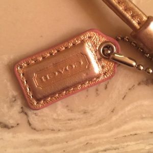 This is a shinny rose pink Coach wristlet with coach c and tiny little charm. Very cute for a night out, and it can hold cards and a little cash. Maybe even a small phone. Good condition