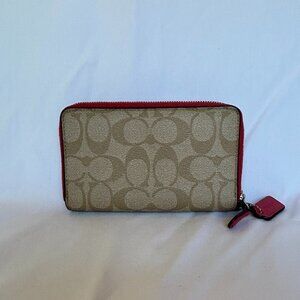 Color: Tan, pink accent trim on zipper, wrist strap and interior