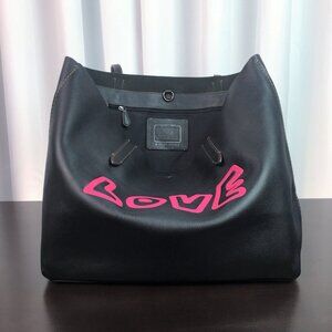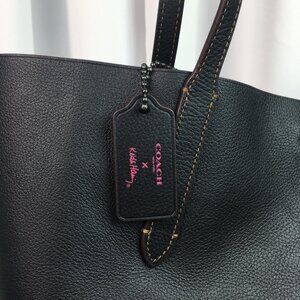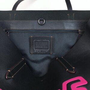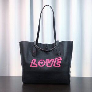 This authentic Coach fashion tote is made from top-quality black leather and comes brand new with a tag. This beautiful designer purse is a piece from the exclusive collection created through a collaboration between Coach and Keith Haring. This stylish carryall has the iconic Coach hang tag alongside Keith Haring's "Love" art on the front. Featuring a single compartment with a convenient zip pocket inside, this signature bag is elegant and functional. More details:
