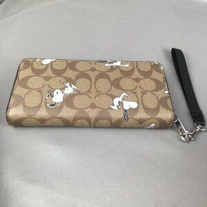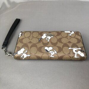 "This Coach x Peanuts collaboration wristlet features the iconic Signature brown canvas adorned with playful Snoopy prints, blending fun and fashion perfectly. Designed with a zip-around closure, it offers multiple card slots and compartments for coins—stylish and practical. Comes with the original Coach gift box, perfect for gifting or collecting.