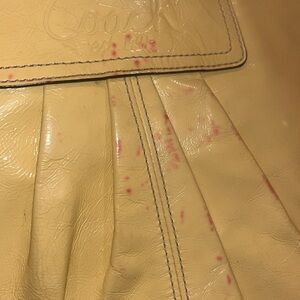 14” by 10” by 5 “ inches Approx with a strap 12” inch drop.  Yellow patent leather tote hand bag with silver hardware.  Smoke and pet free home.  Some pink color transfer on bag front as pictured.  No returns a price reflects some condition issues. Pretty clean inside and all zippers work