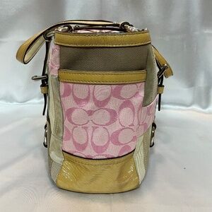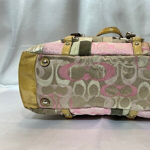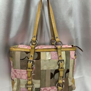 Coach zipper Tote. Lighter colored signature print patchwork. Buckle detail and silver tone hardware and 2 leather straps.