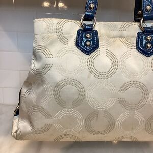 Authentic Coach Ashley Dotted OpArt Carry All Satchel is a stunning addition to your closet! Beautiful tan on tan canvas bag with gorgeous navy blue patent leather accents. Detachable strap allows this bag to be a satchel and a shoulder bag. Tan sateen interior in beautiful condition. 2 slip pockets & 1 zipper pocket inside. Hang tag included. Long strap included. Patent leather detailing pairs beautifully with dotted “c” pattern. Silvertone hardware. Zoom on photos & watch video for more detailed description.