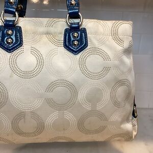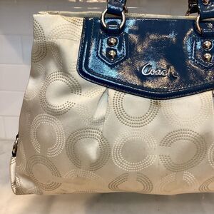 Coach Ashley Dotted OpArt Tan /Navy Blue Canvas/Patent Leather Carry All Satchel