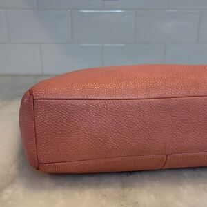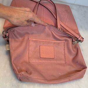 Authentic designer Coach Pebbled Leather Prairie Satchel Crossbody Bag is beautiful!! Preowned. Stunning pink pebble leather is absolutely gorgeous. Silver hardware accents. Zipper pocket on front of bag for easy access. Full zipper top protects coordinating pink signature fabric interior with one zipper pocket. Interior fabric could use a good cleaning. Double leather handles in outstanding condition. Detachable long crossbody strap, adjustable. Sold for $250 on another e-commerce selling site. Approximate measurements 10.23"L x 9.44"W x 2.75"H Strap drop-5" Long strap drop- 22" Photos are part of the description, zoom to see the new condition of this gorgeous bag. Feel free to ask questions. Make an offer!!