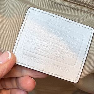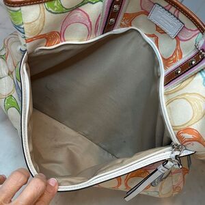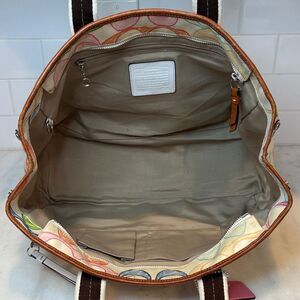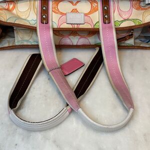 Authentic designer Coach Hampton Scribble Signature Logo Multicolor Tote Bag is preowned. This vintage Coach tote features a distinctive "Scribble Signature" pattern on a cream canvas exterior, showcasing the classic Coach "C" logo rendered in various pastel colors like pink, orange, blue, green, and tan. Overall it's clean, but could use a quick refreshening up! The playful, hand-drawn look of the "scribble" motif gives it a unique and charming appeal. The double handles are a combination of leather and canvas, in pink with white stripes and brown accents, offering a comfortable grip and a handle drop of around 10 inches. As a large tote, it's designed to be spacious and functional for everyday use, whether for casual outings, work, or travel, adding a vibrant and cheerful touch to any ensemble. It's great for work or play! This "Expansion Tote," include side snaps that allow the bag to be contracted or expanded for additional space. Approximate measurements - 15" x 10" x 6" Photos are the most accurate description of this beautiful vintage tote. Ask questions and make an offer!
