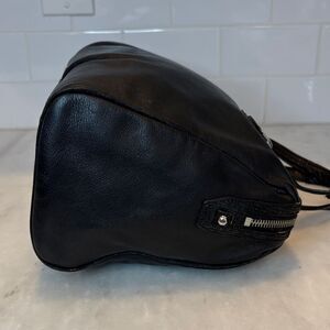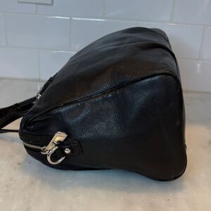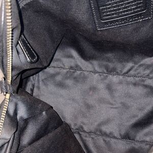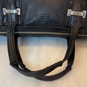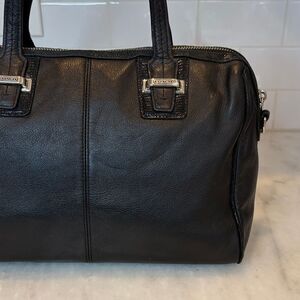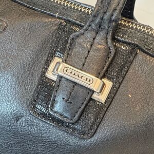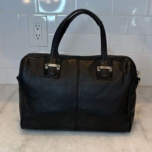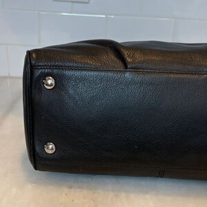 Authentic designer Coach Bordeaux Taylor black leather Convertible Satchel is a staple in your closet! Double handles in good shape.. Silvertone hardware labeled with designer name. 2 interior slip pockets & 1 interior zip pocket. Feet on the bottom of the bag. Zipper top protects black sateen interior with slip pockets and zipper pocket. No long strap with no ring on exterior (removed). Priced accordingly. Approximate Dimensions: 12”x9”x4” Approximate Strap Drop: 4” from handles. Photos are the most accurate description of this classic leather Coach bag. Zoom on photos, ask questions and make an offer!