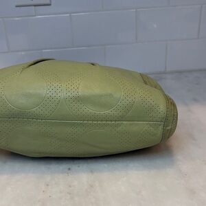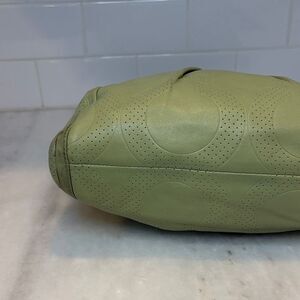 Authentic designer RARE Coach Parker Perforated Signature Op Art Logo Leather Hobo Convertible Shoulder Bag is preowned. Gorgeous mint green leather with perforated signature C logo in Op Art style. This is a very rare bag, making it a collector's dream. Zipper compartment on the front for easy access. Interior is also a mint green fabric to coordinate with the exterior. Slip pockets and zipper pocket for organization. Detachable long strap, so you can carry as a crossbody, or a short strap to carry as a shoulder bag. Check out the hang tag!!! It's perforated too!! That alone could probably sell for $25+, it's a hot item.
