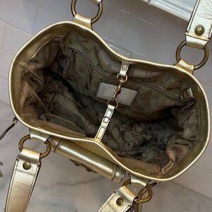 Authentic designer Coach Legacy Straw & Metallic Leather Tote Shoulder Bag is preowned. Coach Legacy Straw Tote, featuring a natural woven straw body with metallic gold leather trim and handles. This vintage-inspired tote combines casual charm with classic Coach craftsmanship. Vintage 2005. Crafted with a natural woven straw body, complemented by metallic gold leather trim and dual rolled leather handles. Features brass-tone hardware, including an oversized front buckle on the exterior flap pocket. It boasts multiple exterior pockets for practicality, including a front flap pocket with a magnetic snap closure and two zip side pockets, often adorned with long tassel pulls. A metallic Coach leather hangtag dangles from the handle base. The interior is lined with Coach's signature fabric, in a beige or striped pattern, and includes a zip pocket and slip pockets for organization.