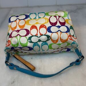 Designer authentic Coach Rainbow Scribble Jacquard Signature Logo mini bag with teal & tan leather accents and silver hardware is one of the most desirable bags on the market!! Blue, red, yellow, purple, teal, orange logo. Everyone needs this classic Coach mini bag!! Turquoise stitching on front leather Coach logo panel. Clean gorgeous turquoise interior. No hang tag. Exterior has no rips, tears or stains. This bag is a must-have for your collection. Photos are the best description of this adorable, hard to find EUC, mini bag!! Please ask questions. Approx. 7.5"x5"x4 strap drop- 5"-7" Make me an offer!!!!