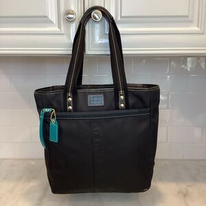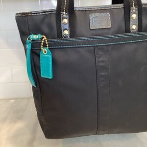 Authentic Coach Black Sateen Hampton Shopper Weekend Tote is a great addition to your closet! Fantastic turquois stitching is beautiful with matching hang tag!! Front interior zip pocket and bag exterior magnetic clasp pocket. Teal stitching and detailing. Top zipper keeps your belongings protected. Interior is a clean teal color that POPS!! Spacious interior with 2 slip pockets and 1 zip pocket. Fabric handles with leather detail. See photos for more detailed description of this great Coach tote. Please ask questions.