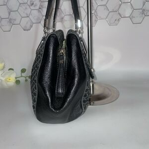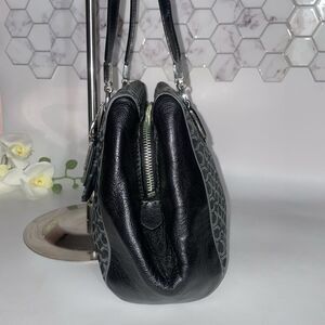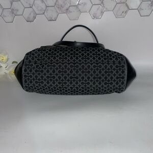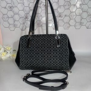 This sophisticated Coach shoulder bag features a sleek black design with a classic monogram pattern. Crafted with black leather trim and handles, it offers versatile carrying options with both shoulder straps and a detachable crossbody strap. The silver-toned hardware adds a touch of elegance to its structured silhouette.