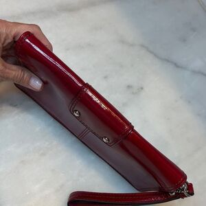 Authentic Coach Bleeker Patent Leather Buckle Wallet Clutch Bag in vibrant read patent leather. Embossed Coach logo on the front of the clutch. Large silver buckle with coordinating hardware is perfect on the red. Matching wrist strap and hang tag. Strong snap closure protects tan interior. Six card slots and one cash slot. Two additional full sized compartments and a full zipper compartment to secure change or your most important items. Easily fits a cell phone. Accordion style allows the clutch to expand as you fill it. This bag can elevate any outfit. Approximate measurements - 9" x 4.5" x 1" Photos are the most detailed description of this vintage clutch bag. Zoom on photos, ask questions and make an offer!