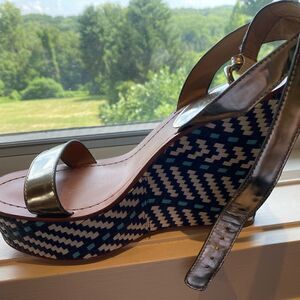 EUC Coach navy and white wedge platform shoe with silver straps. Perfect addition to your summer wardrobe: