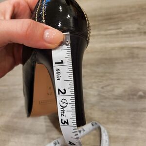 black heels pumps with brass buckle